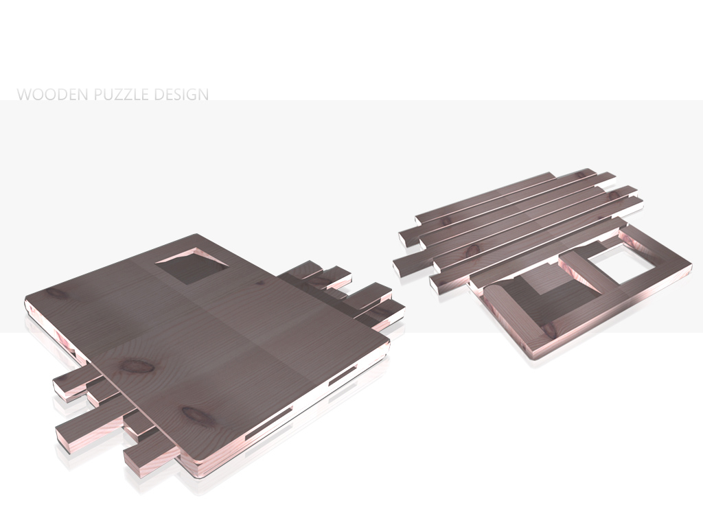 3D product concept render. • Wooden puzzle money-box, designed for children, built from wood.